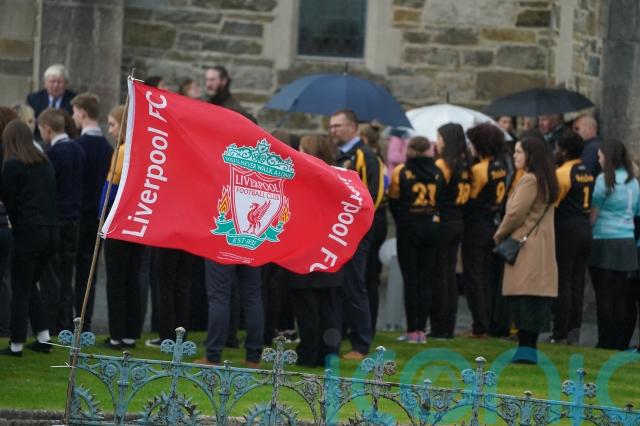 A flag of Liverpool FC, who Leona supported, was put up outside the church ahead of the service.
