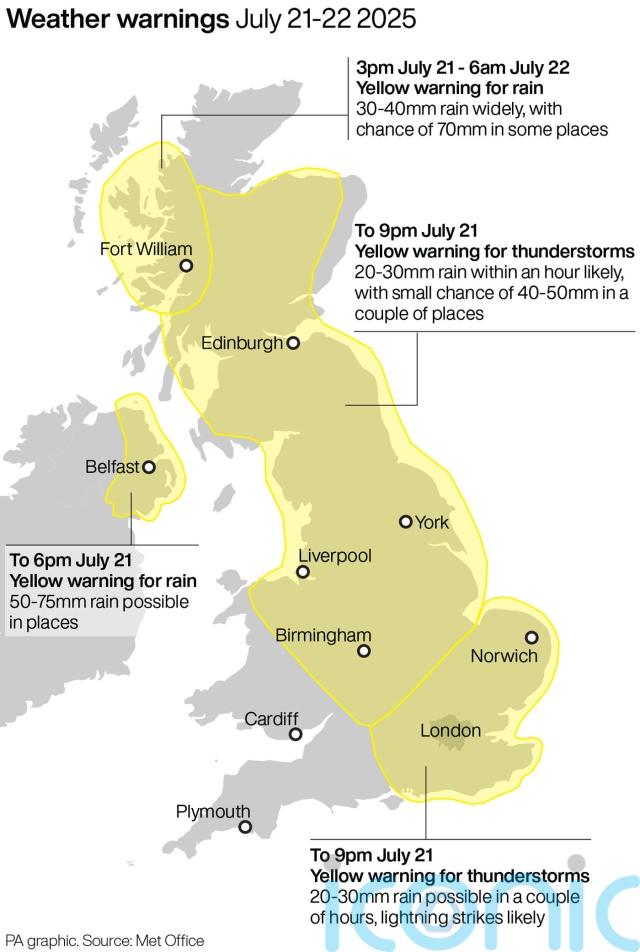 The region records an average of 89mm of rain in July, meaning more than half a month’s rainfall could hit Northern Ireland in less than a day.