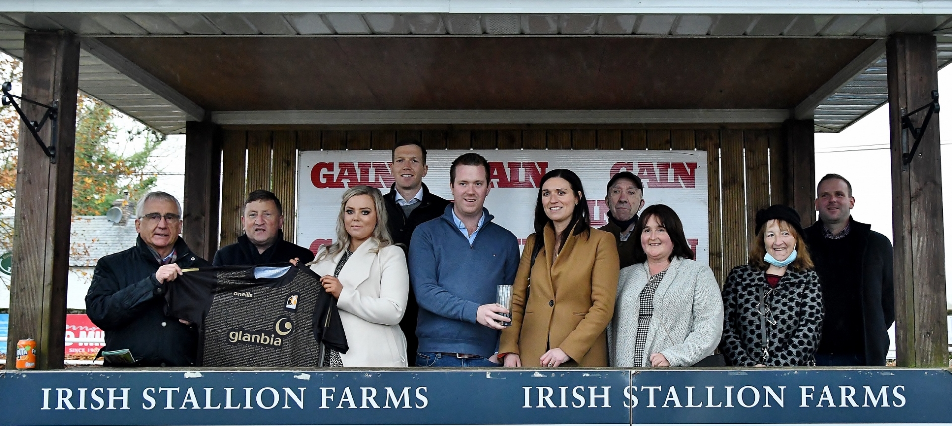 Paul Holden Jnr makes a presentation to the Barcoe Family, trainer of the winner of the Holden Plant Rentals Mares Handicap Hurdle