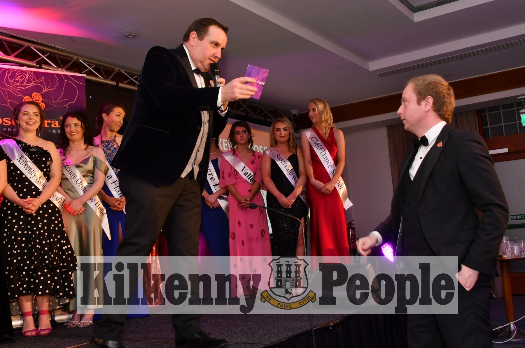 MC Ollie Turner receives the envelope containing the winner's name from Judge Mark Irwin.