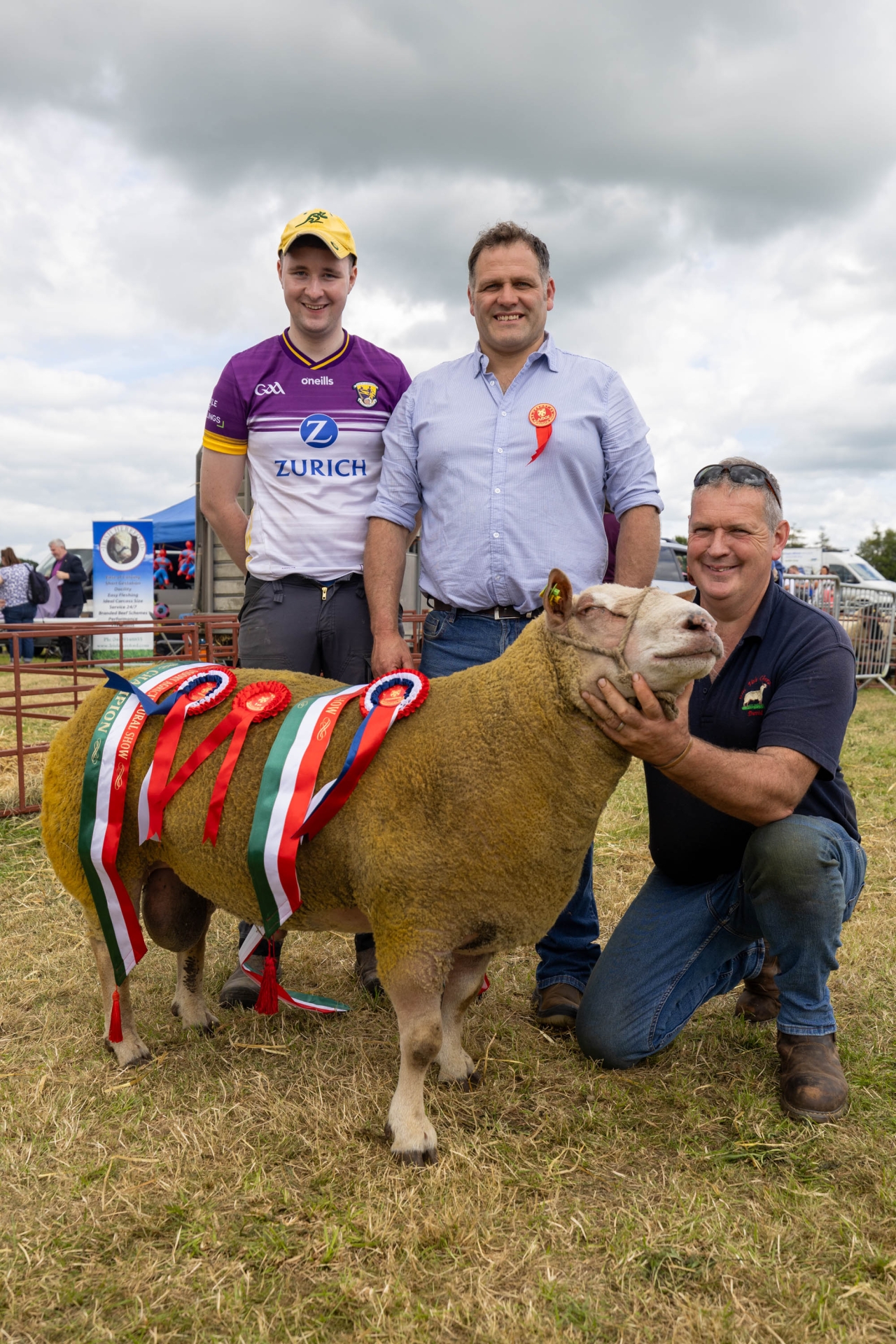 The champion sheep of the show ‘Uppertown Mick Jagger’ owned and shown by David and Gyll Condon from Freshford, Co. Kilkenny pictured with judge Joey Walshe from Dunlavin at The Ossory Show, Sunday 28th July 2024.