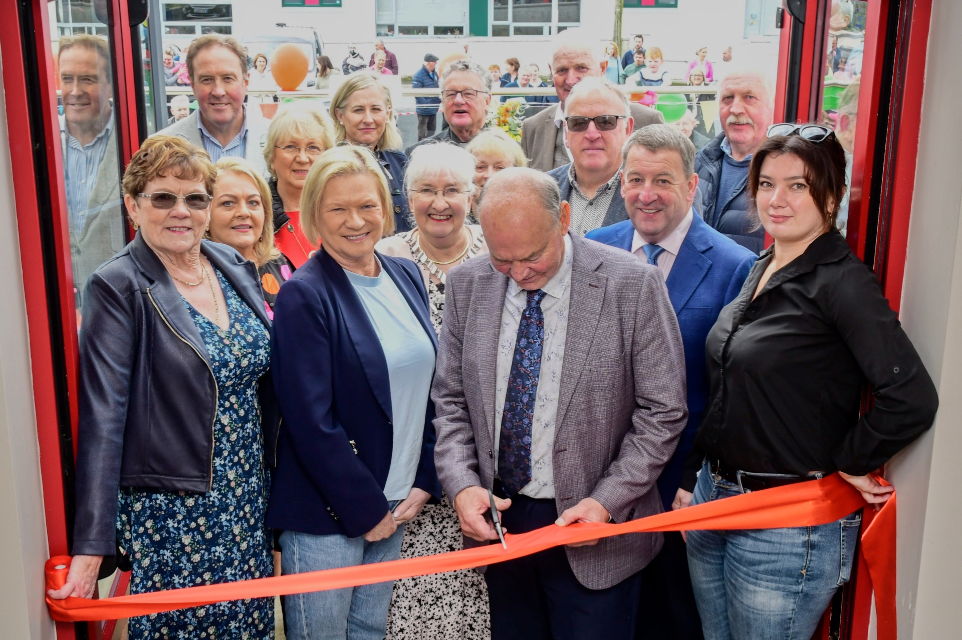Cutting the ribbon to officially open the Muckalee Community Centre was Ger Comerford. Also in the photo: Declan Rice, Mary Kelly, Maura Tynan, Eileen Dunne, Cathaoirleach Mary Hilda Cavanagh, Kevin Mahon, Cllr. Pat Fitzpatrick, Ger Murphy and Lisa.