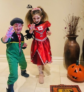 Ali and Freddie Farrell, Radestown, dressed up as a dead farmer and a dead cheerleader!