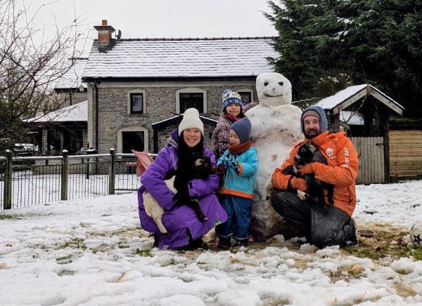 Zoe, Zelda, Zander & Paul Mahon Wong with their snowman and two Pygmy Goats Nacho & Sonny from Thomastown
