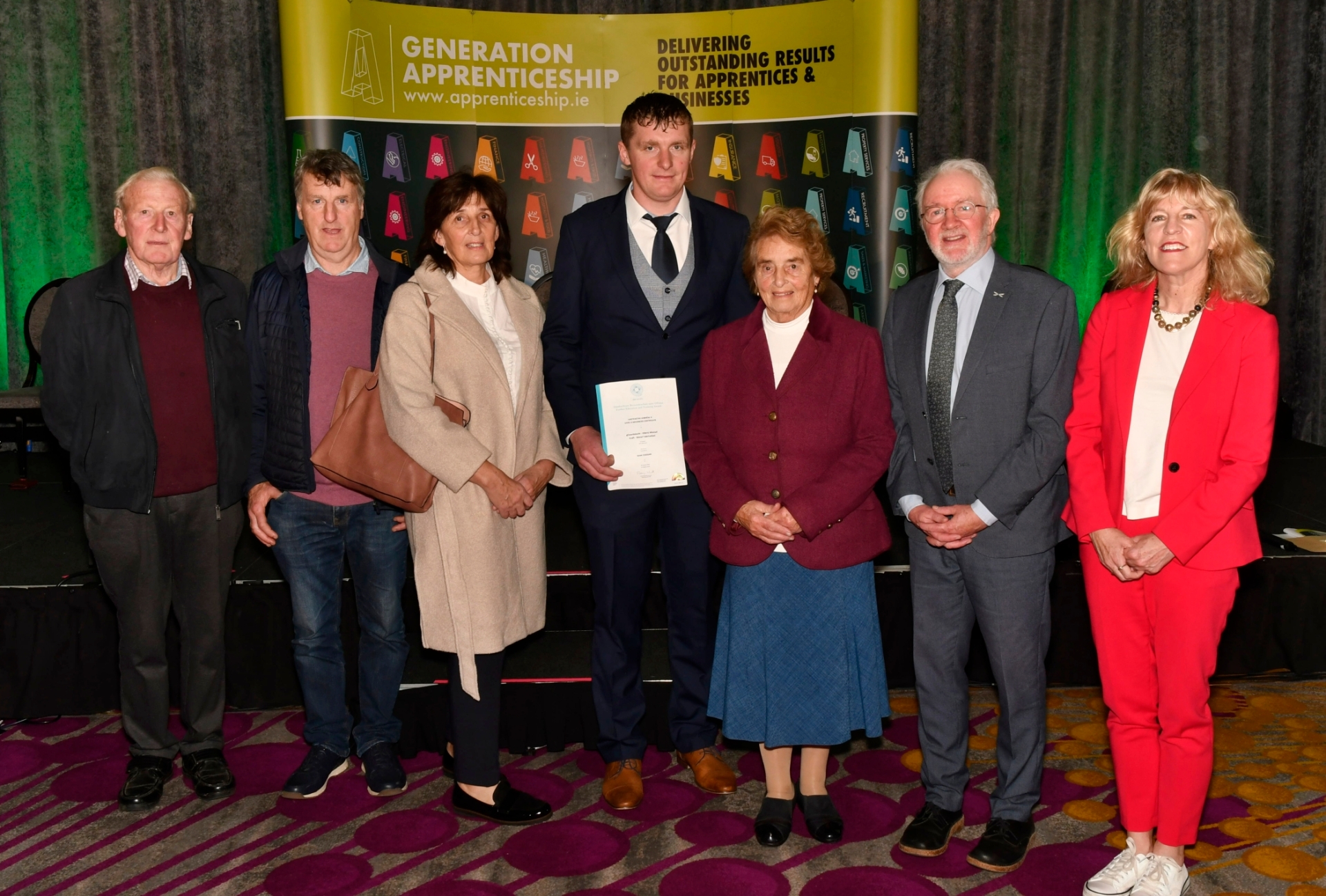 Metal Fabrication Graduate Apprentice Sean Coogan (centre), from Castlecomer, who works for Dunreidy Engineering in Kilkenny, is pictured with members of his family, including his mother, Mary Coogan (left), and granny Delia Brennan (right), following his graduation at the National Apprenticeship Awards 2022 for the south-east region at Lyrath Estate Hotel, Kilkenny. The event was hosted by Kilkenny and Carlow Education and Training Board (KCETB) for the region and supported by SOLAS, Tipperary ETB, and Waterford and Wexford ETB. Sean is also a nominee for the inaugural Generation Apprenticeship Apprentice of the Year Awards, taking place in Dublin this month. Also pictured are Minister of State at the Department of Housing, Local Government and Heritage Malcolm Noonan, TD and Director of the National Apprenticeship Office Dr Mary-Liz Trant