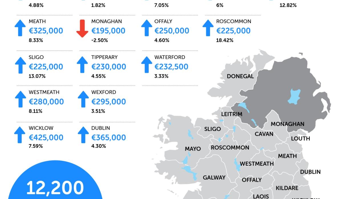 Asking prices for a three-bed semi-detached house in the county rose by €2,000 in the last year to €237,000. This means prices rose by €2,000 over the quarter.