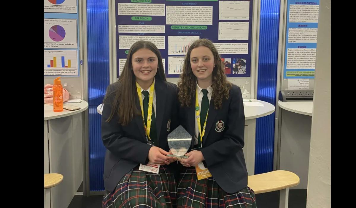 A group of Transition Year students from Presentation Kilkenny, aided by their science teachers, won first place in the Social and Behavioural Sciences Intermediate group category. Their project, titled ‘A Look into Our Minds: When Are We At Our Most Dangerous?’, was highly commended by judges.