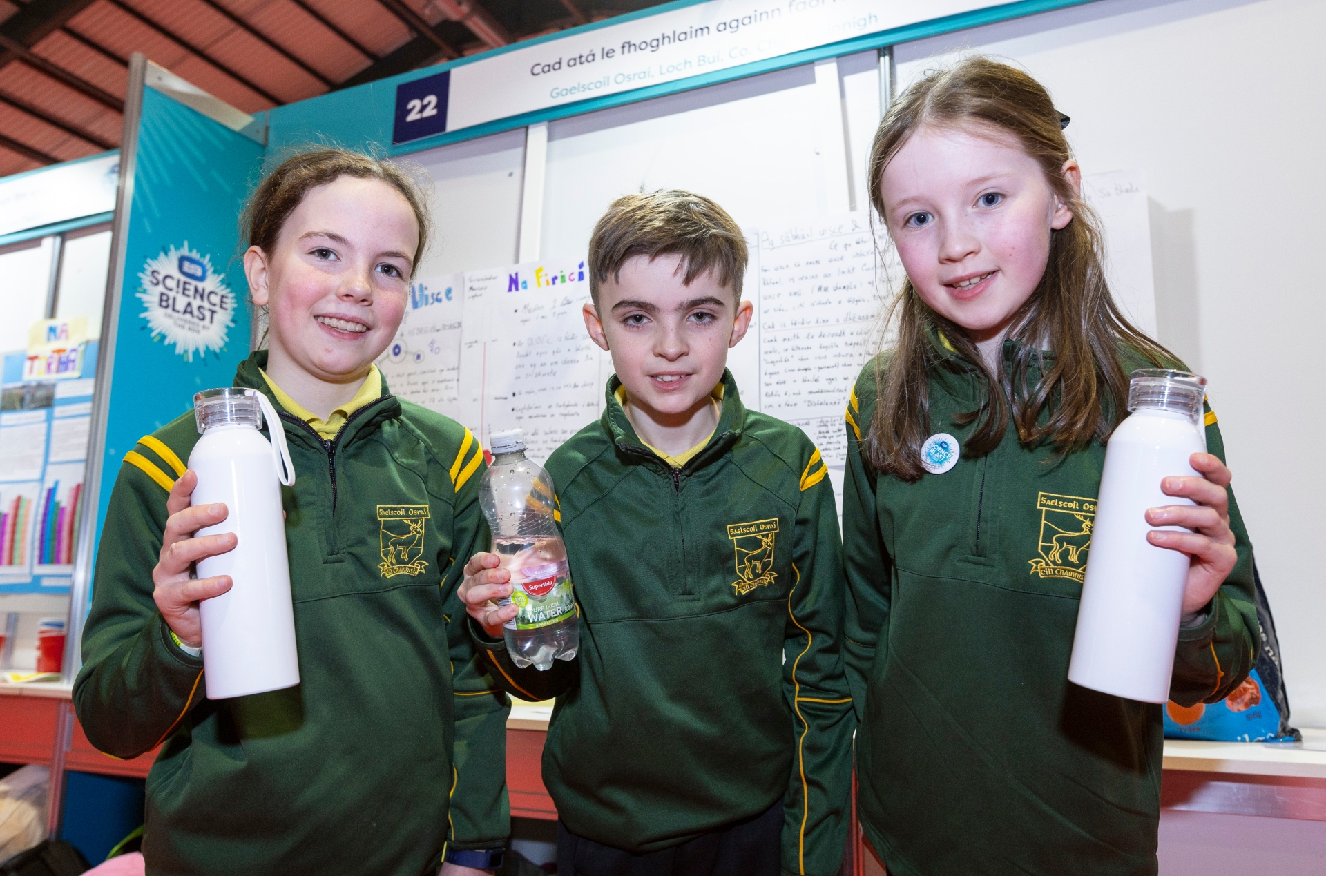 Pupils from Gaelscoil Osraí, Loch Buí. Chuir siad an cheist: ‘Cad atá le fhoghlaim againn faoi H2O?’