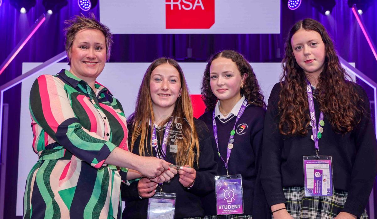 Colaiste Pobail students Muireann Greene, Annabel Campion, and Faye De Breit caught judges’ eyes with their project ‘Red Alert – Creating a deterrent to drivers breaking red lights’, winning the Road Safety Authority Award.