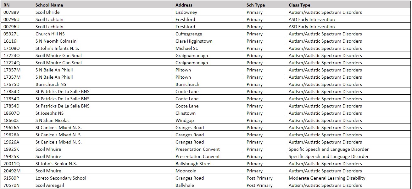 The National Council for Special Education (NCSE) has today published the list of special classes available in Primary and Post Primary schools across County Kilkenny. The list provides important information to assist parents in supporting their child’s education.