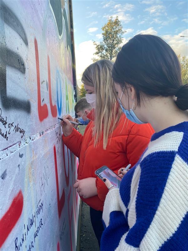 Transition Year students from Coláiste Mhuire Johnstown pictured in front of a mural in Belfast