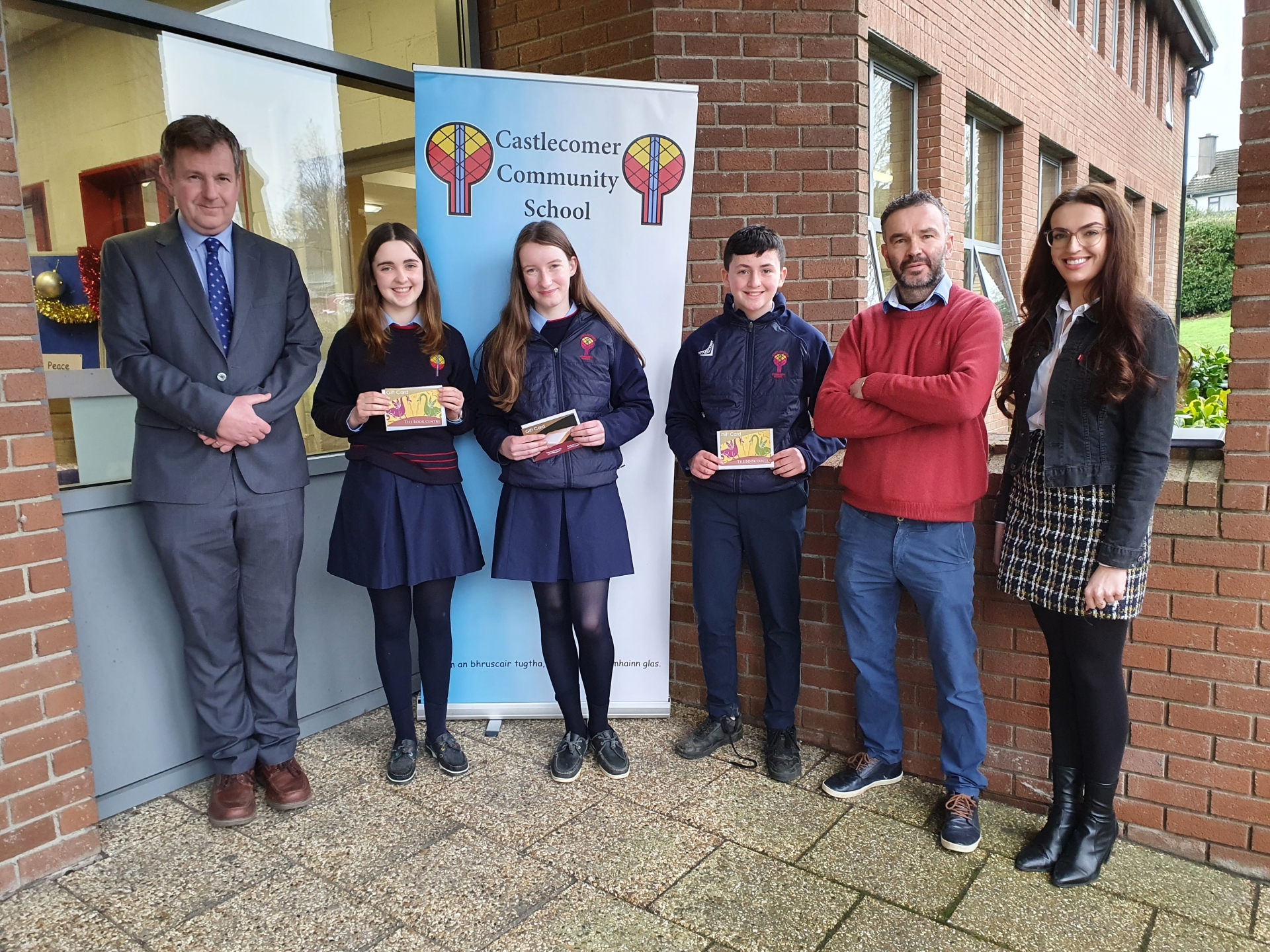 1st Year: Ellie Byrne (best academic), Cara Doyle and Greg Doyle (class spirit award) with Principal Pat Murphy, Year Head Pat Nolan and Tutor Teresa Bourke.