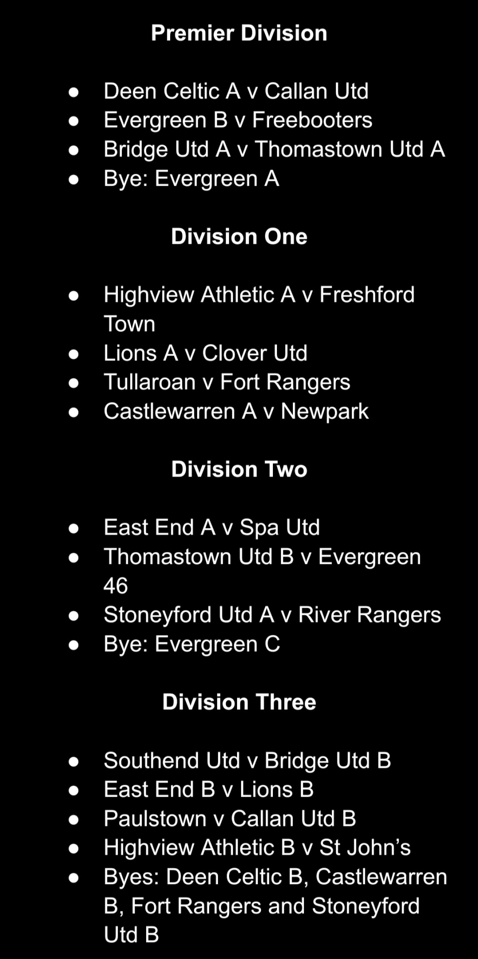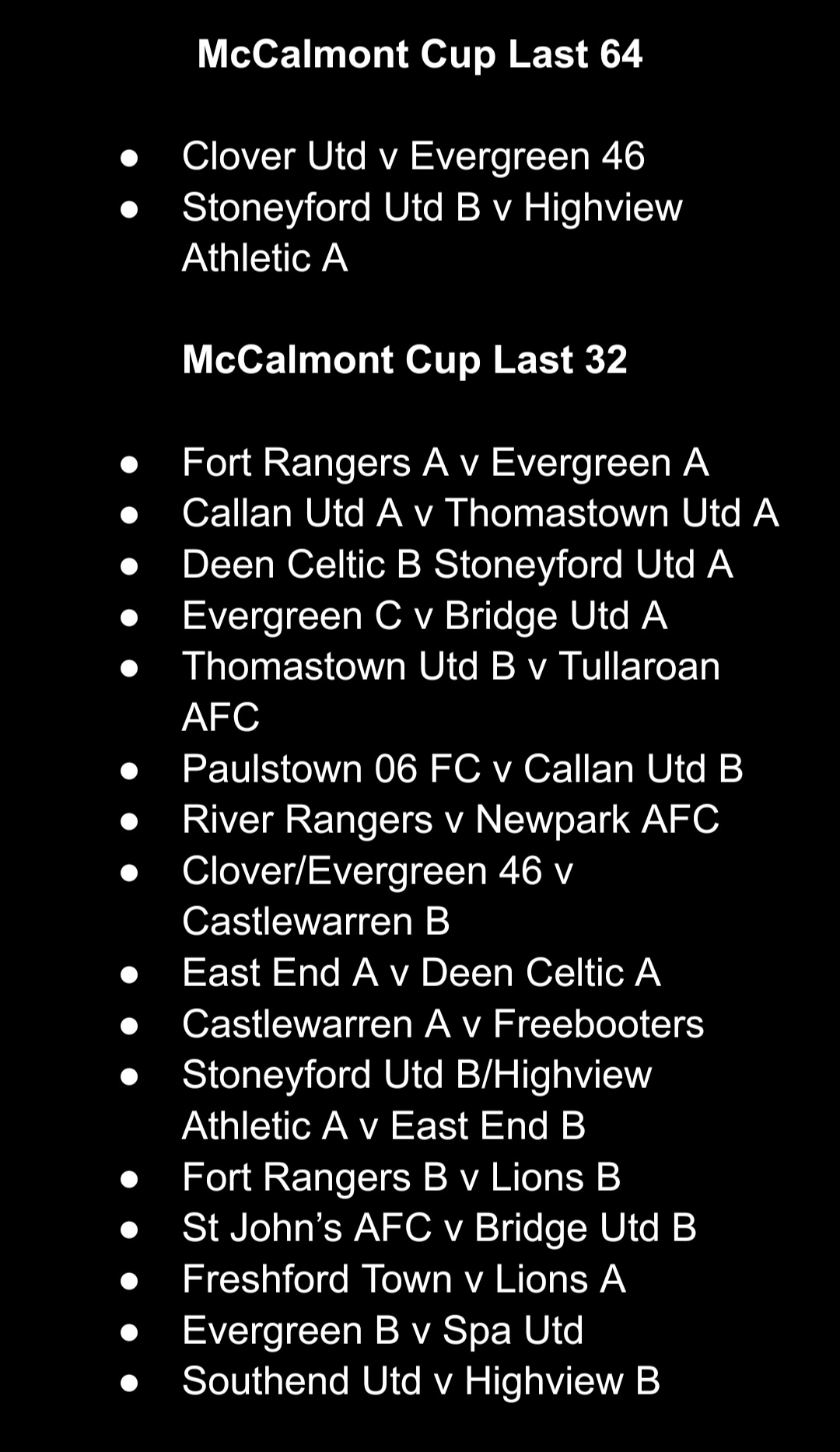 The draws for the Divisional Cup competitions took place on Community Radio Kilkenny City's (CRKC) Offside programme on Tuesday evening, while the McCalmont Cup draw took place last weekend (SEE LIST BELOW).