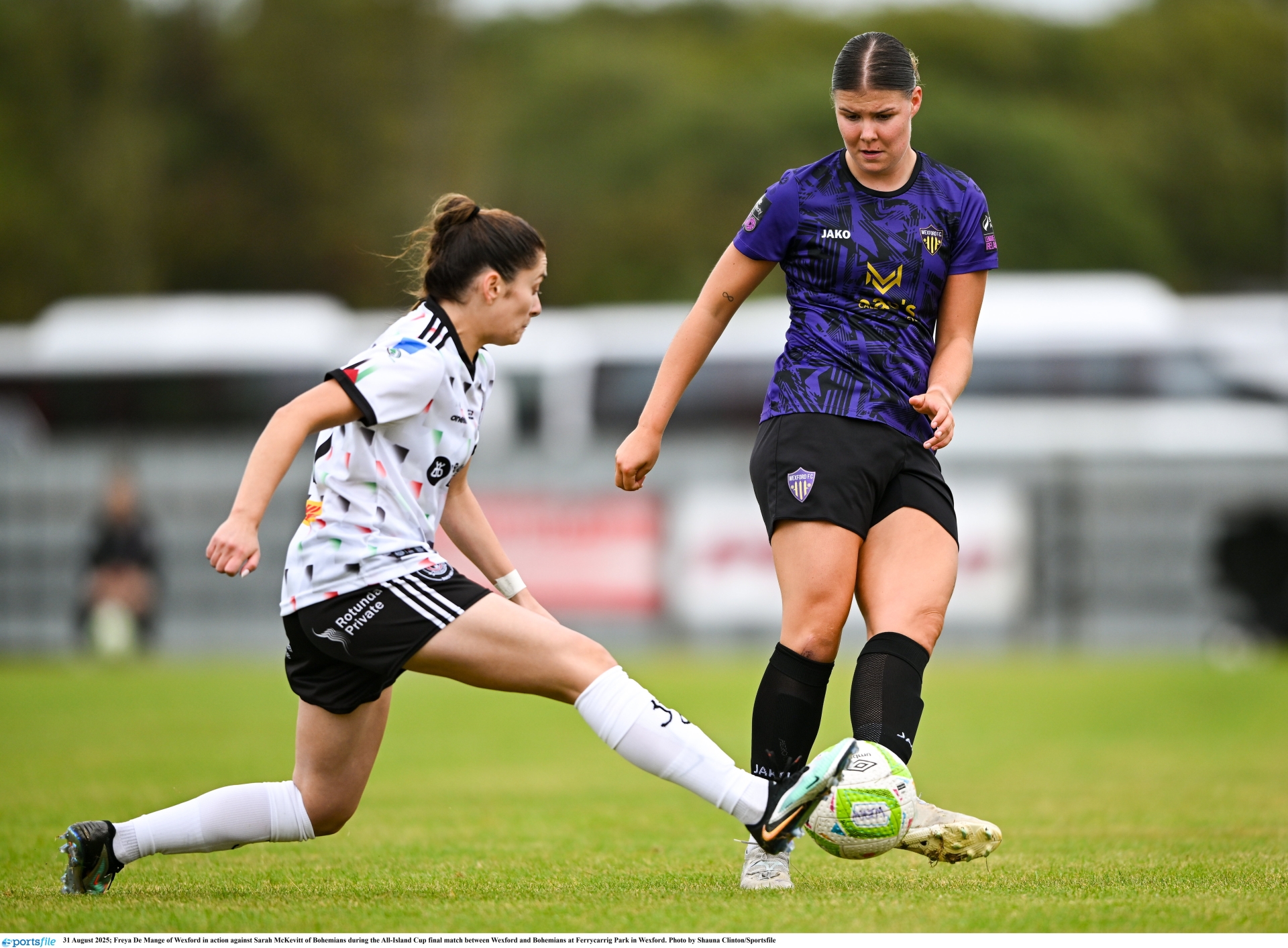 Freya De Mange of Wexford in action against Sarah McKevitt of Bohemians during the All-Island Cup final match between Wexford and Bohemians at Ferrycarrig Park in Wexford Picture: Shauna Clinton/Sportsfile