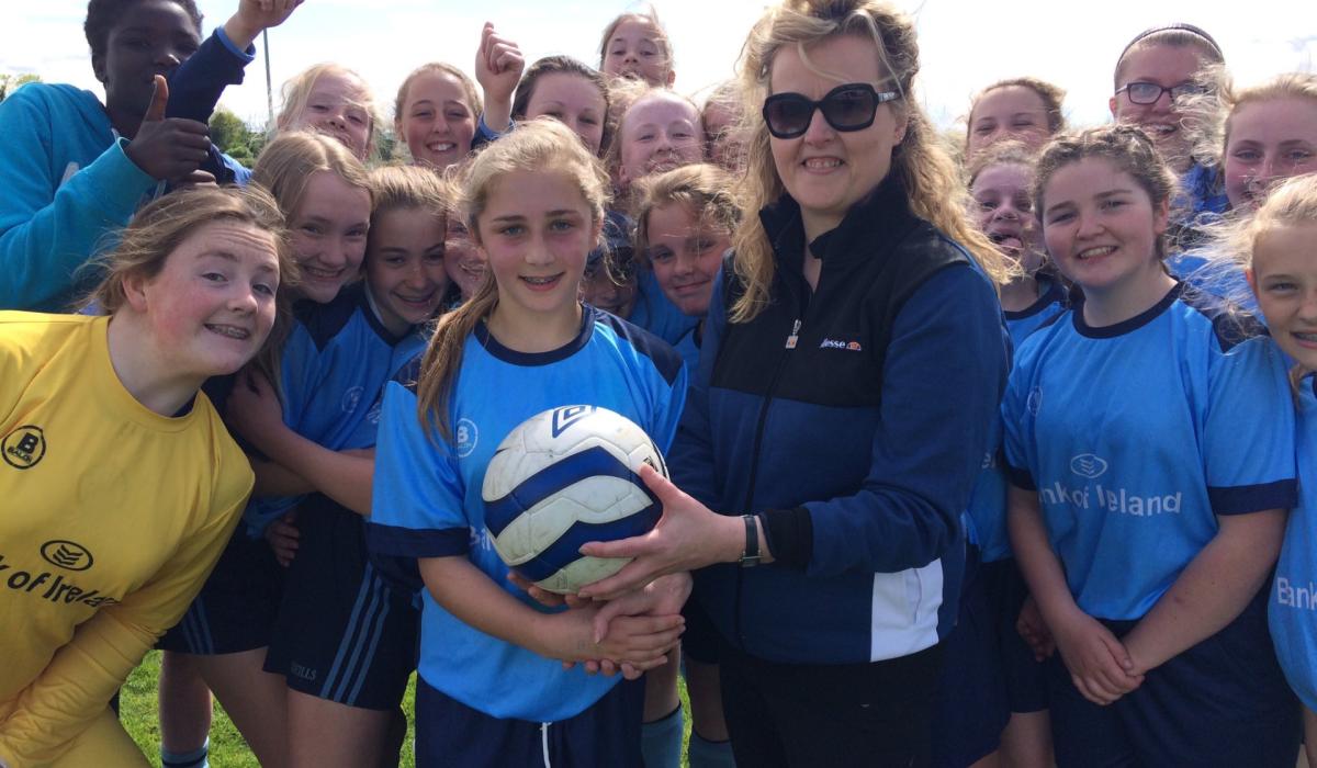 Pres hat-trick heroine Ellen Molloy is presented with the match ball by teacher Monica Kierans. Photo: FAISchools