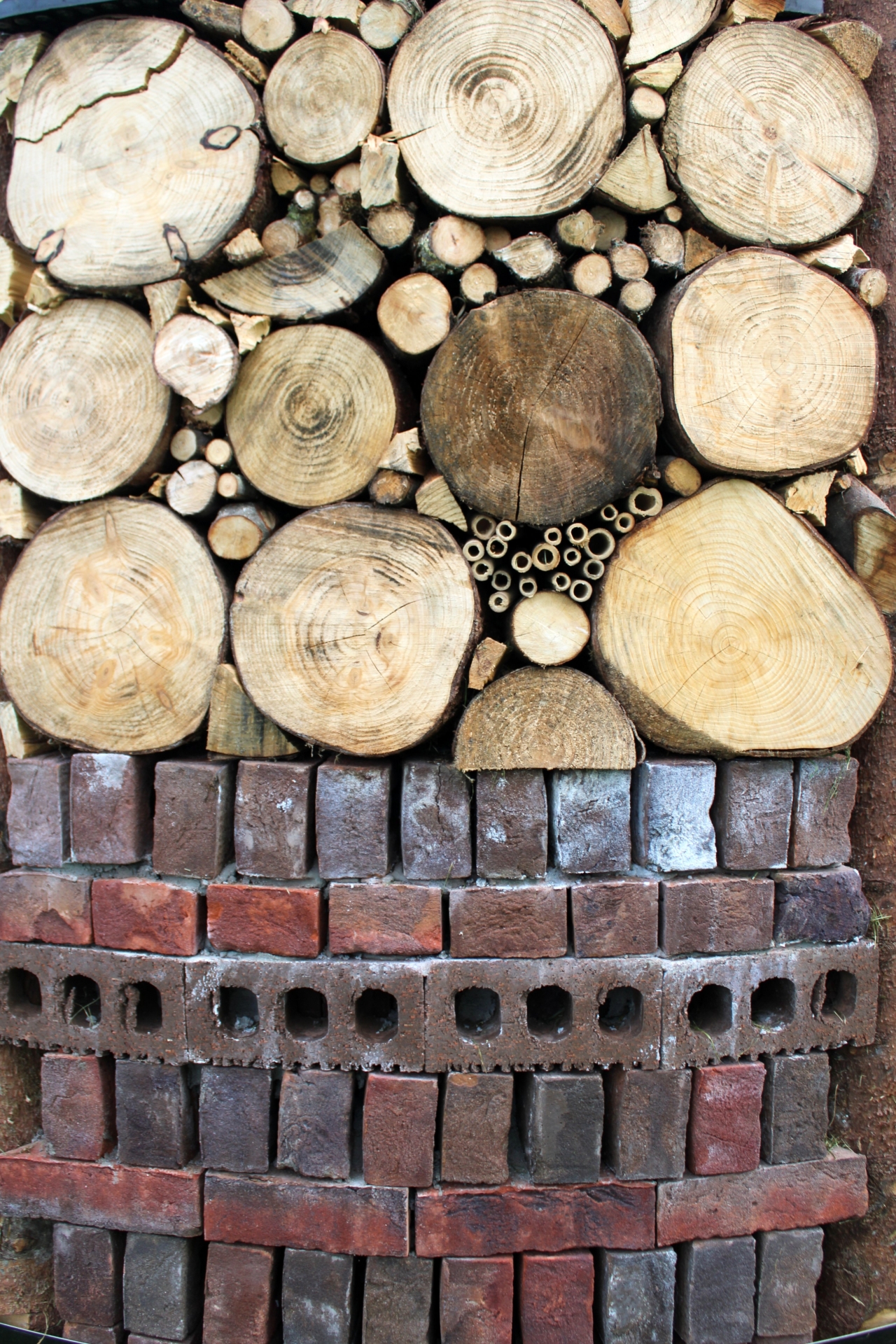 Next layer – behind bamboo canes – leaves, straw, pine cones, acorns, rolled cardboard and twigs. Next layer – timber logs and bamboo all above 6mm hollow bore. Also two robin nest boxes. Next layer – 650 high bricks loosely packed.