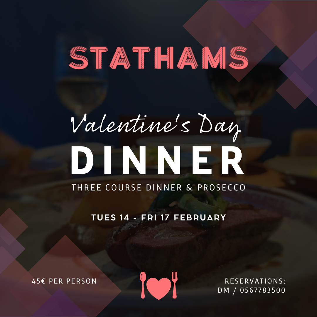 This Valentine's Day, let Statham’s Bar & Restaurant show you what it means to be truly in love - with delicious food! From starters to sweet treats, Statham’s chefs have lovingly chosen the freshest ingredients from the best local food producers. Enjoy a dinner full of heart-warming Market Menu dishes with a glass of prosecco 14th - 17th February for €90 per couple.