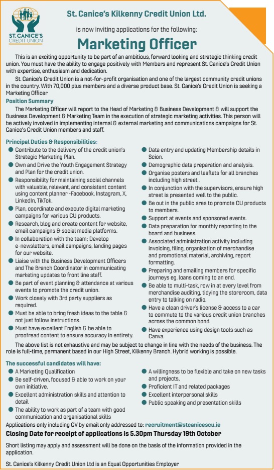 The Marketing Officer will report to the Head of Marketing & Business Development & will support the Business Development & Marketing Team in the execution of strategic marketing activities. This person will be actively involved in implementing internal & external marketing and communications campaigns for St.Canice’s Credit Union members and staff.