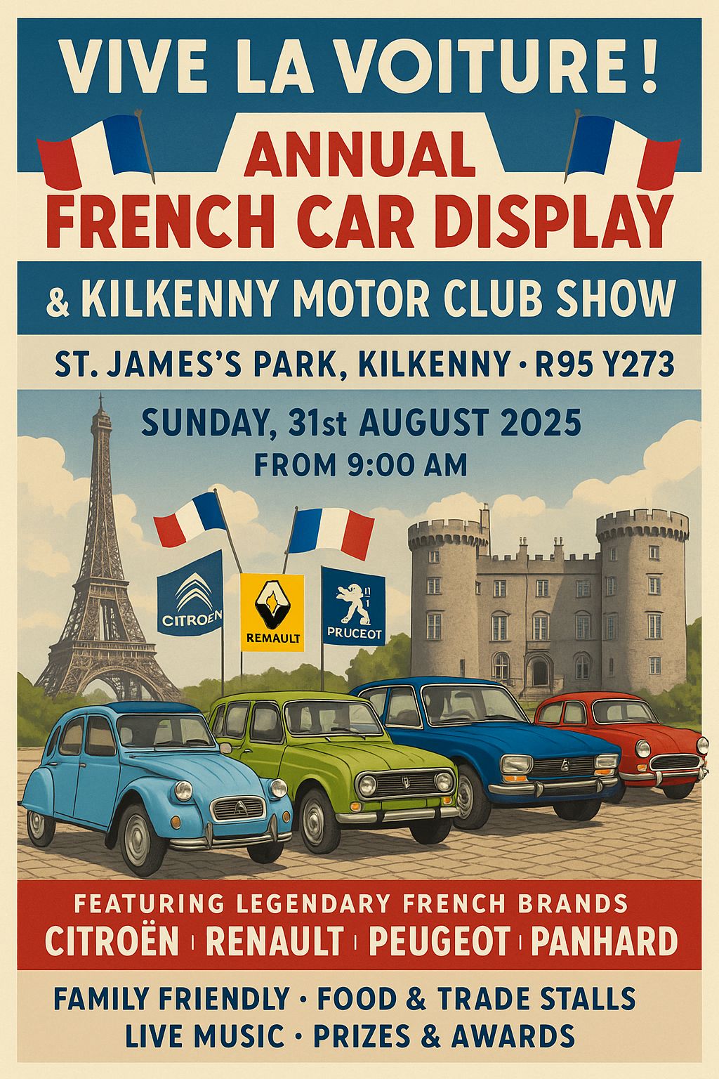 Kilkenny Motor Club is delighted to invite the public and all classic and vintage owners to its Annual Classic and Vintage Show on Sunday, 31st of August 2025, at St. James’ Park, R95 AP92.
