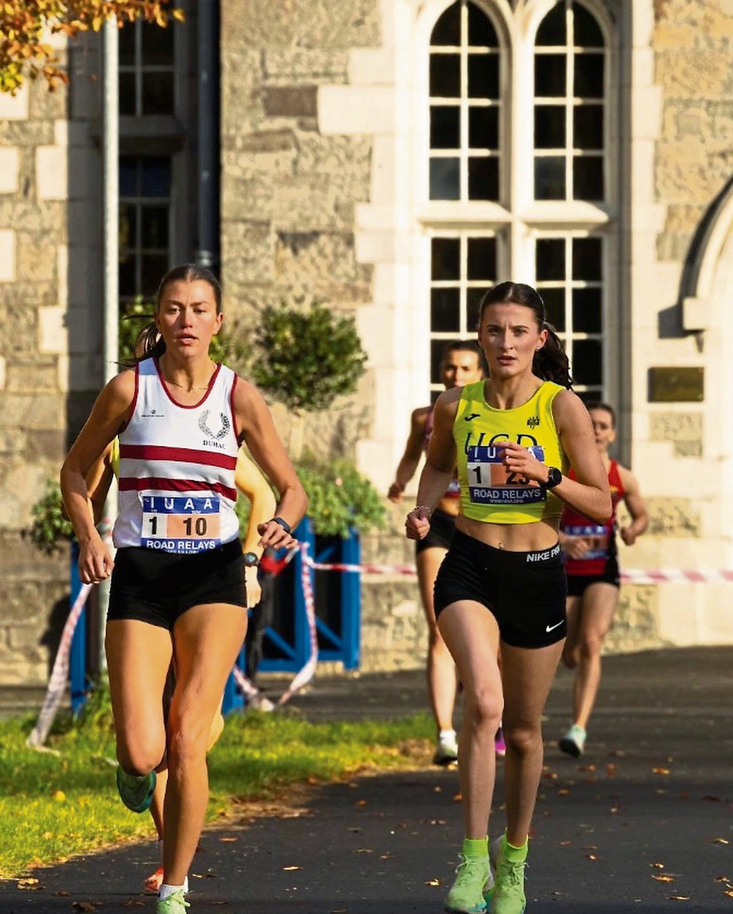 Sophie Jackman from Trinity College (left) races with Susie Nestor (UCD) at the IUAA road relays