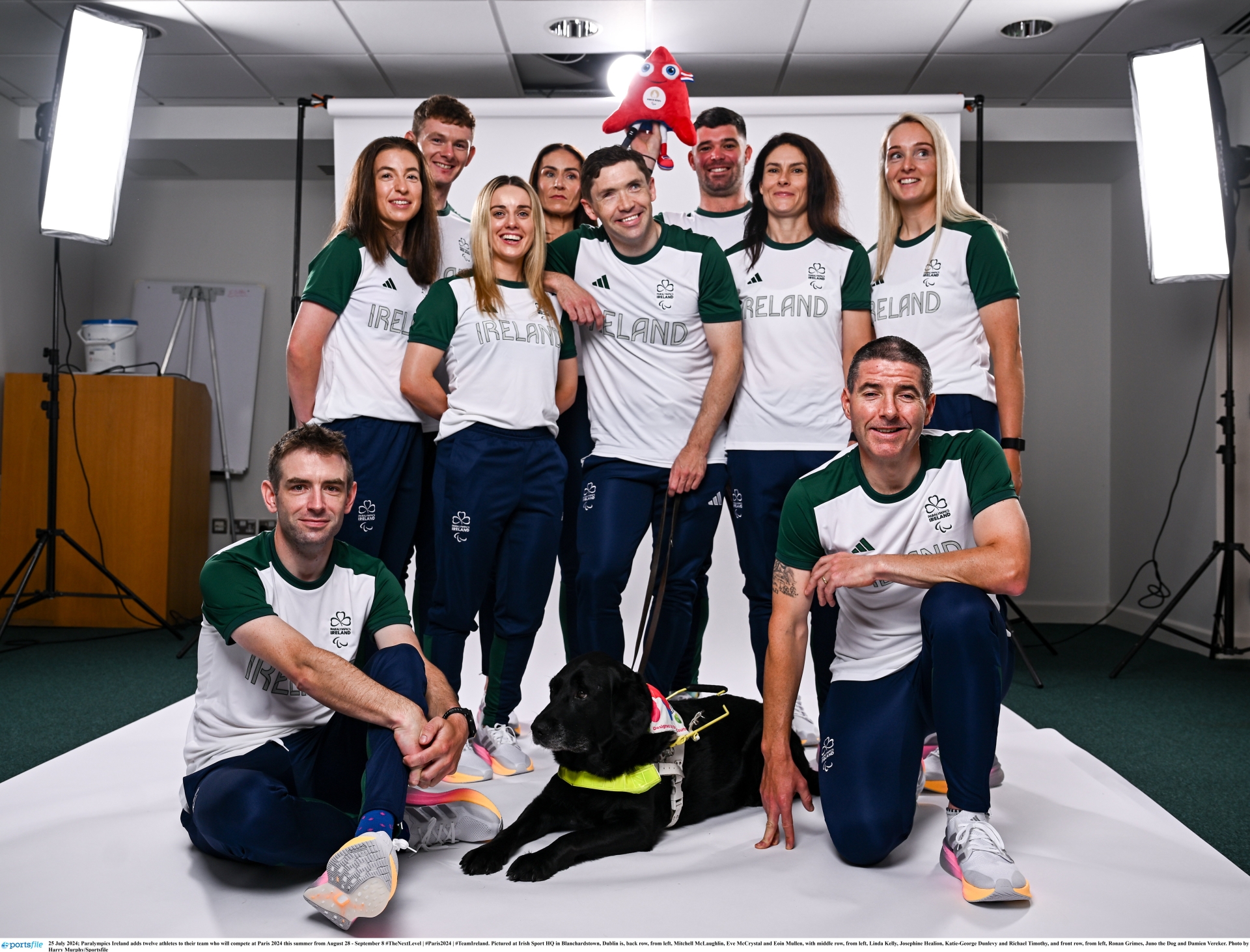 Paralympics Ireland have added 12 athletes to their team who will compete at Paris 2024 this summer from August 28 to September 8. Pictured at Irish Sport HQ in Blanchardstown, Dublin were, back row (from left:) Mitchell McLaughlin, Eve McCrystal and Eoin Mullen, with middle row, from left, Linda Kelly, Josephine Healion, Katie-George Dunlevy and Richael Timothy. Front row: Ronan Grimes, Juno the Dog and Damien Vereker. Photo by Harry Murphy/Sportsfile