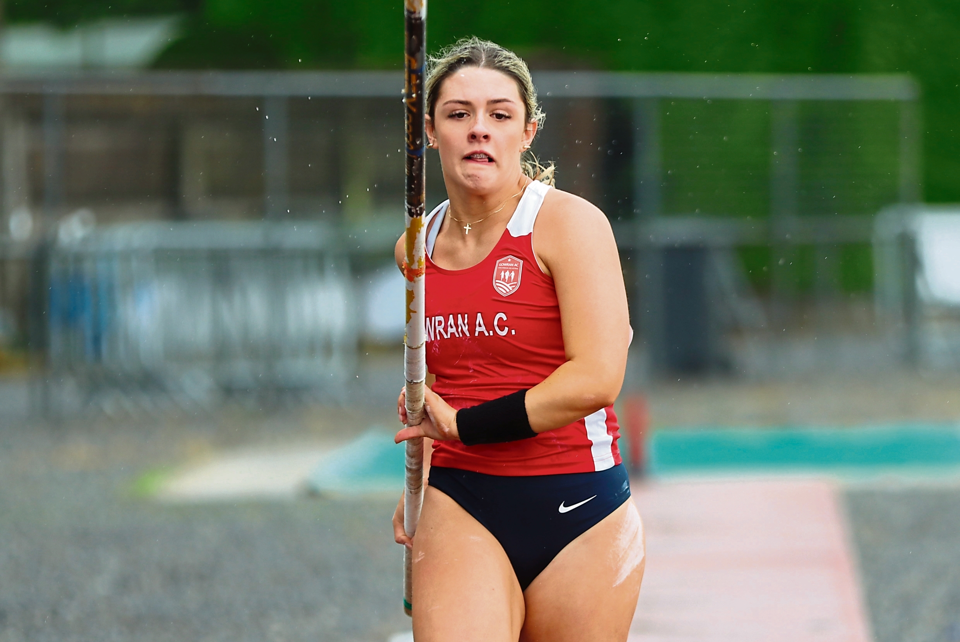 By the afternoon the sunshine had given way to torrential downpours that made conditions very difficult for many of the technical events. The elements hampered Chloe Lynch (Gowran), who finished third in the under-20 pole vault.