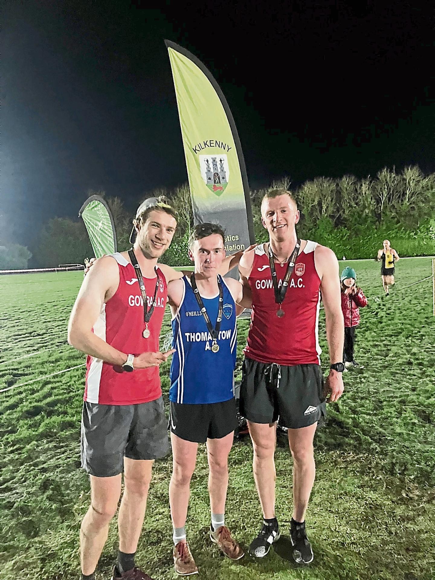 The men’s top three in the 2026 county intermediate cross-country race in Rosbercon: Martin Desgrandchamps, Gowran (second); Tadhg Ryan, Thomastown (first); Sean Morrissey Gowran (third)