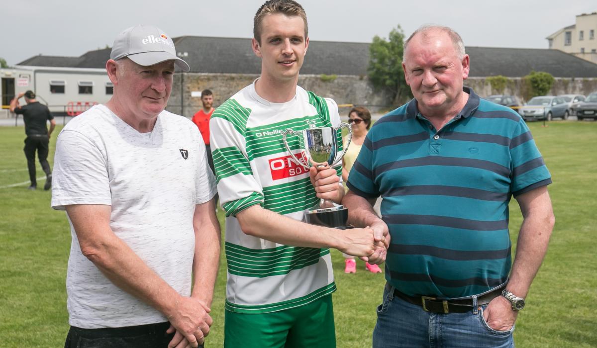 Eddie Teehan (Evergreen C) accepts the Billy Leahy Cup from Tom and Jimmy Leahy PICTURE: PAT MOORE