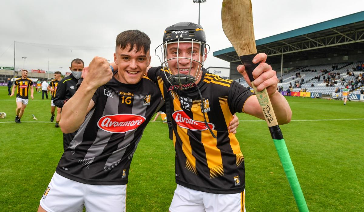 Kilkenny players Oisin Kelly, left, and Denis Walsh celebrate after the 2020 Electric Ireland Leinster GAA Hurling Minor Championship Final