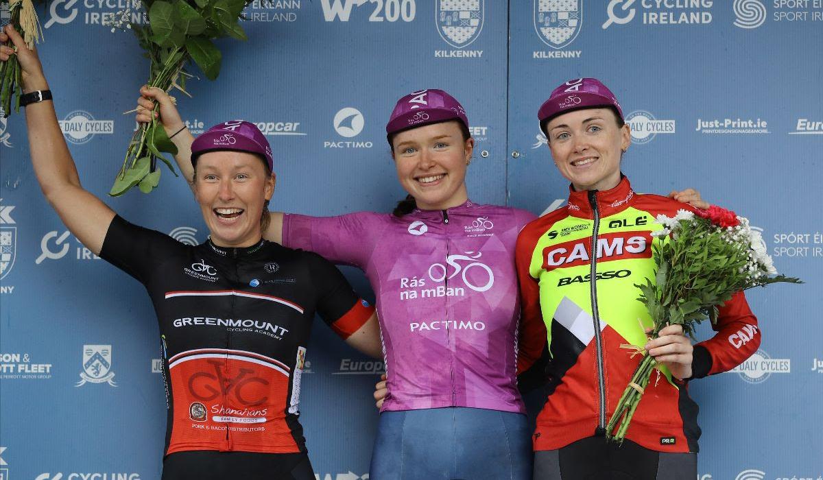 Overall Rás na mBan 2022 winner Kate Richardson on the podium with runner-up Lieke van Zeelst and third placed Becky Storrie PICTURE: LORRAINE O'SULLIVAN