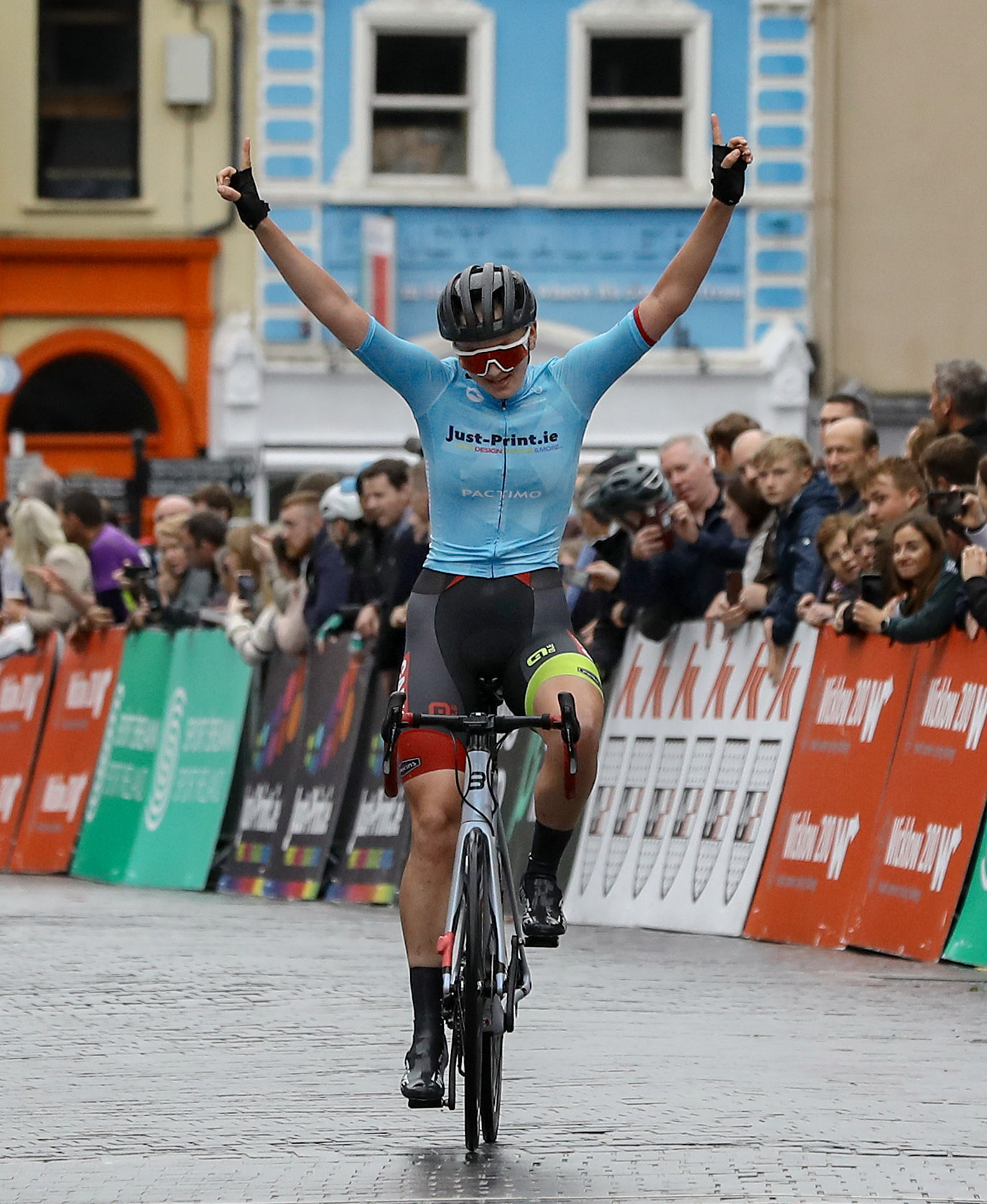 Madeleine Leech of the Cams Basso Team raises her arms in victory after winning the sixth stage of the Rás PICTURE: LORRAINE O'SULLIVAN