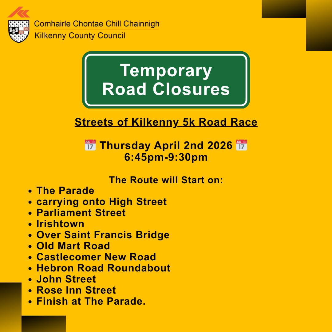 Kilkenny County Council has confirmed road closures will be in place for the Streets of Kilkenny 5k Road Race, taking place on Thursday, April 2nd at 7.30pm.