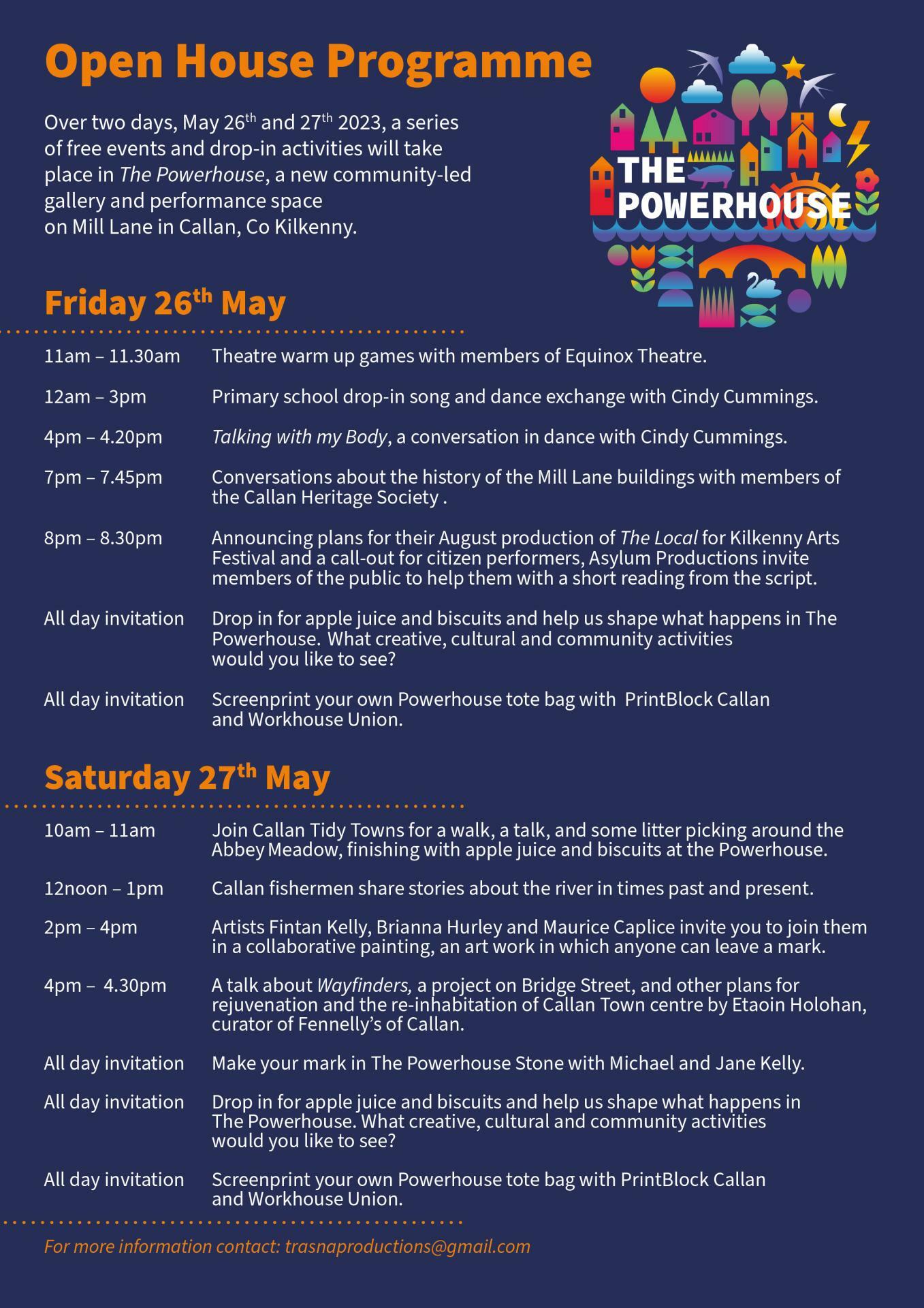 Over two days, May 26th and 27th, a series of free events and drop-in activities will take place in The Powerhouse, a new community-led gallery and performance space on Mill Lane in Callan.