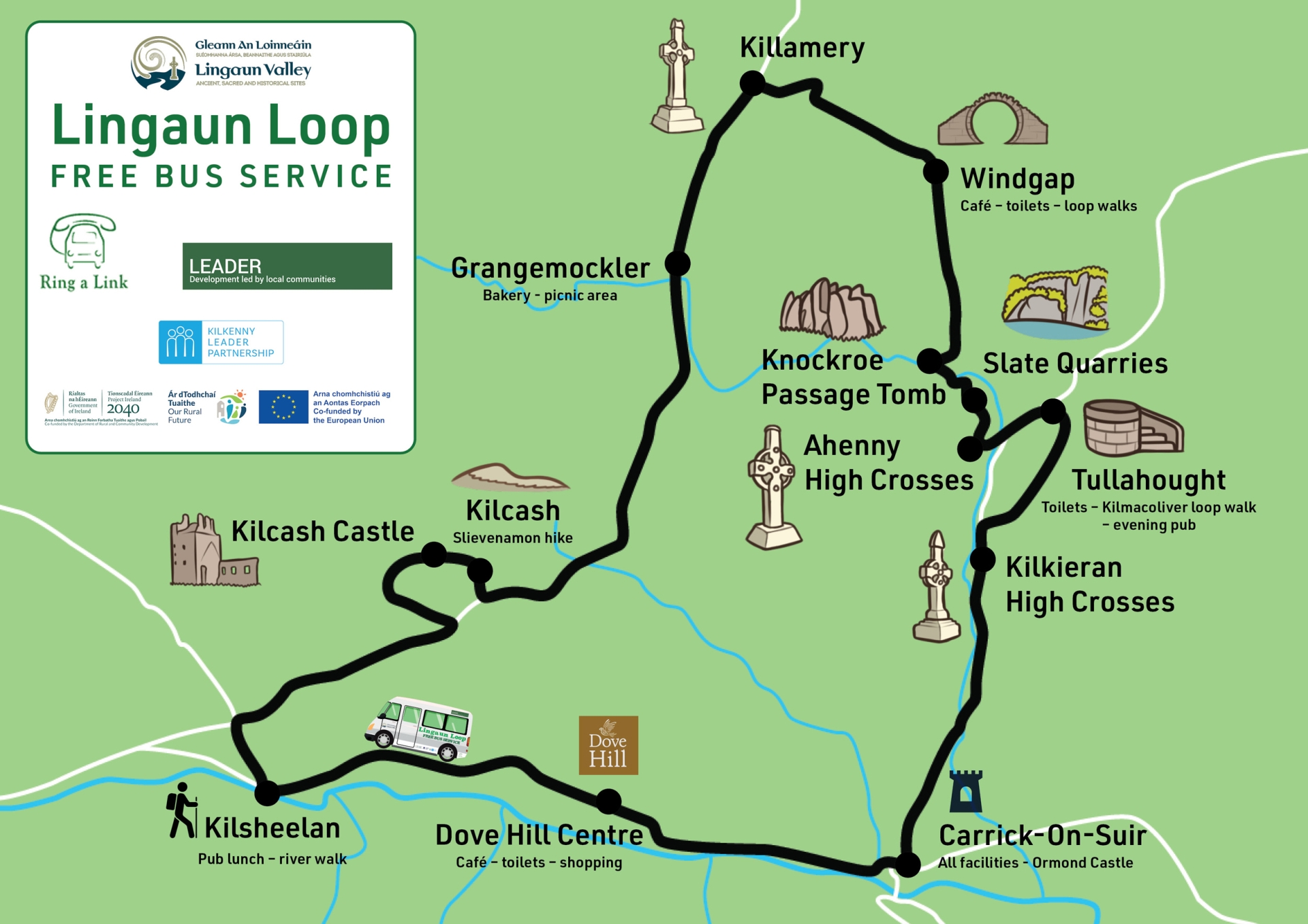 The free minibus service links in with existing bus services from Kilkenny, Tipperary and Waterford and orbits breathtaking parts of South Kilkenny and South Tipperary five times a day, seven days a week.