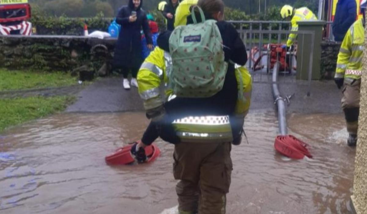 Last October: A firefighter evacuating a student from St Colmcille’s National School in Inistioge after heavy rain caused flooding