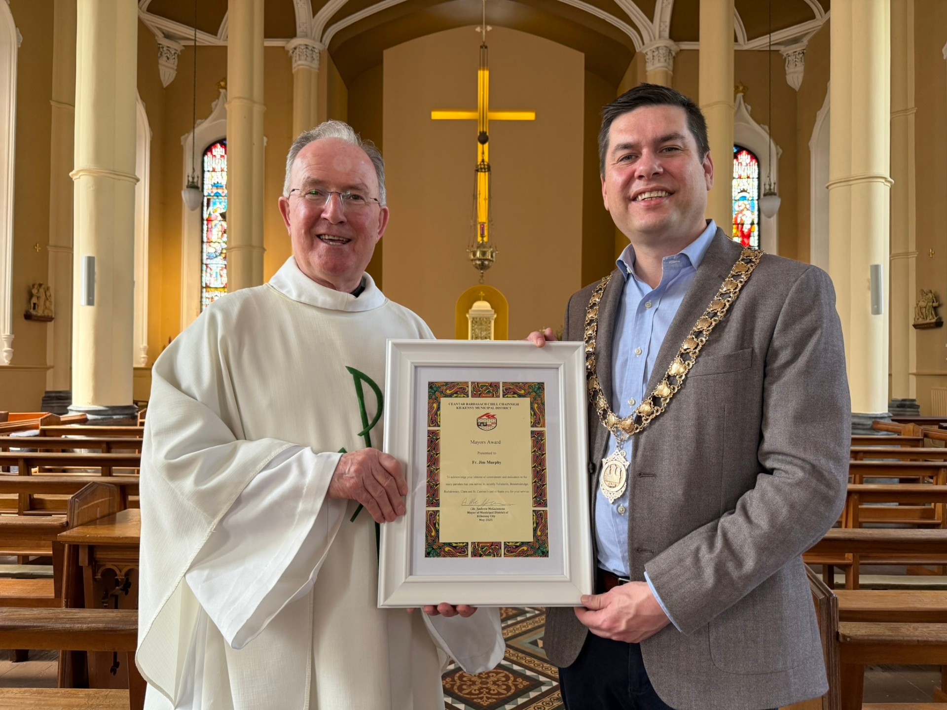 “I’m sure Fr Jim is very surprised as he did not know about this. I want to, on behalf of the people of Kilkenny, acknowledge Fr Jim’s lifetime of commitment and dedication to the many parishes that he served, including Tullaherin, Bennettsbridge, Rathdowney, Clara and St Canice’s, and to thank him for his service,” said Mayor McGuinness.