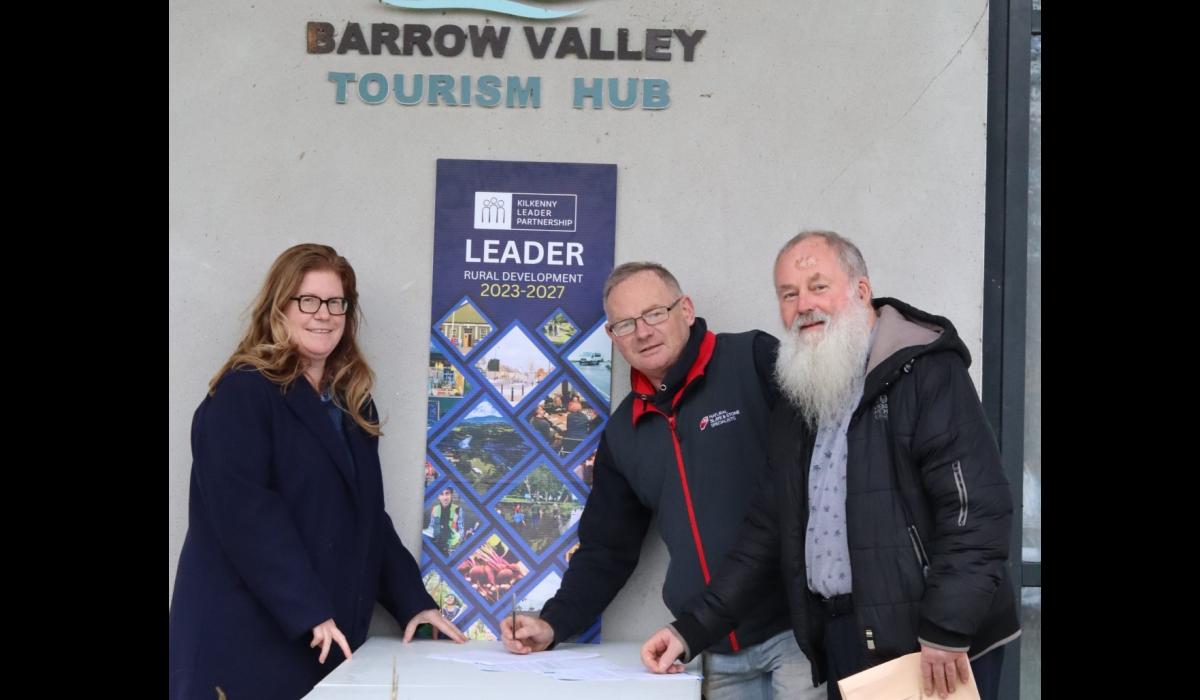 LEADER development officer Julie Kavanagh with Martin O’Brien and Joe Fox of Graiguenamanagh Energy Town signing contracts for community energy funding