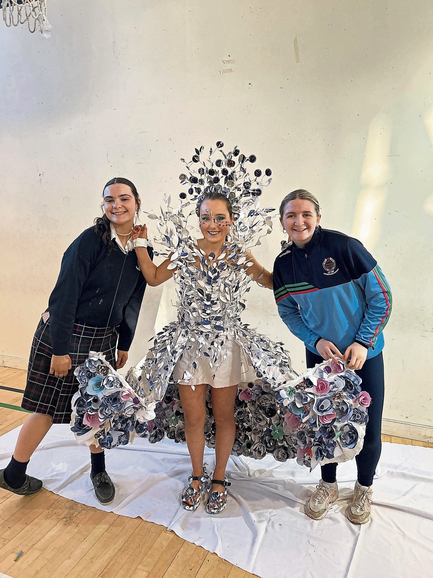 BELOW: Presentation Secondary School students Aine Bambrick (model), Katie O’Keeffe and Jodie Lindsay qualified for the Junk Kouture Regional Finals