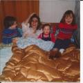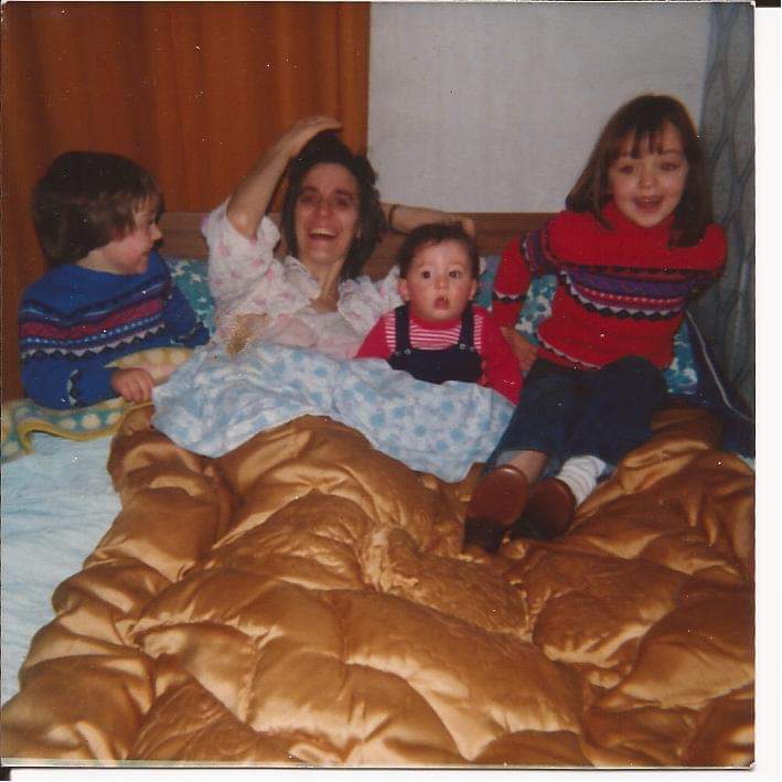 Sharon Lyons is pictured on the right with her brother and cousin as they prevent Mum from enjoying a lie-in