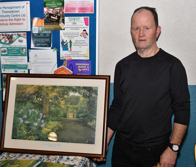 Seamus Quigley, Curator of Thomastown Community Hall, with his print of 'The Lilac Phlox,' Kilmurray, County Kilkenny, by Mildred Anne Butler (1858 - 1941).