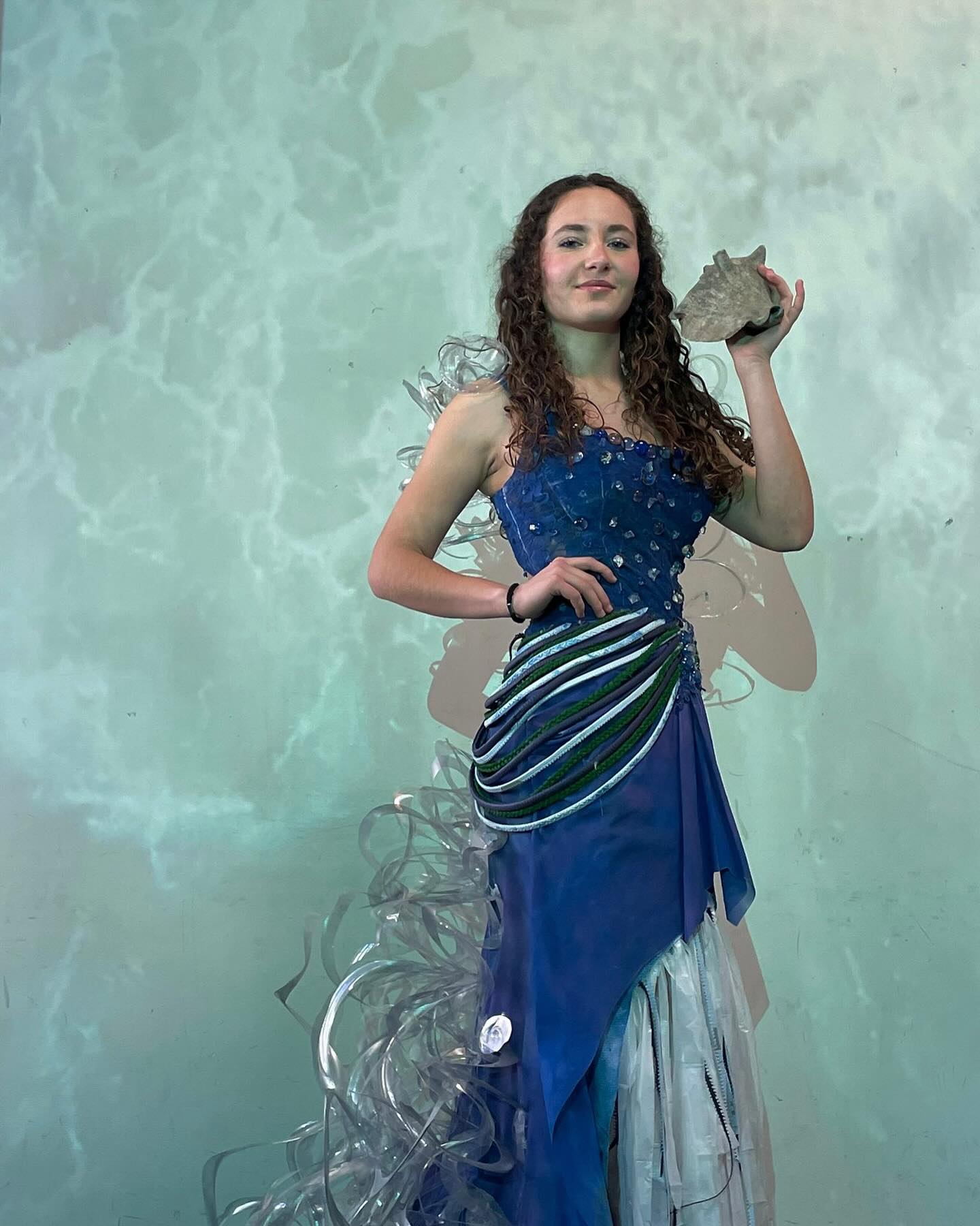 An old debs dress, marbles, wire, plastic aprons, hair extensions, leather scraps, and repurposed plastic bottles converge to form a mermaid-like ensemble.