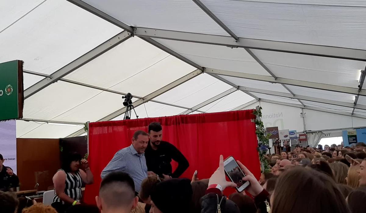 We're not sure who got the bigger cheer for a crowd of mostly secondary school students at the Ploughing Championships; Marty Morrissey or Greg O'Shea.